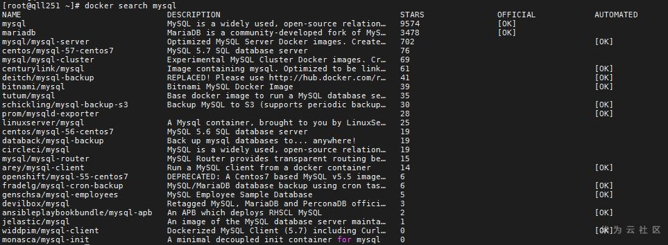 例如,搜索mysql相关的镜像,命令如下: