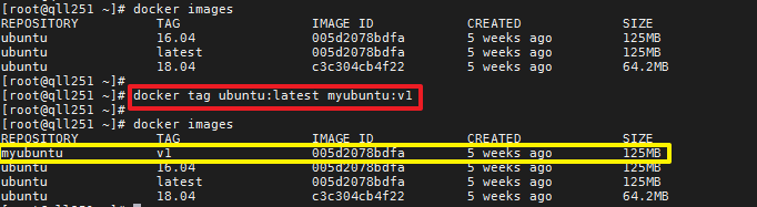 [root@qll251 ~]# docker tag ubuntu:18.04 qinlulu/myubuntu:v1