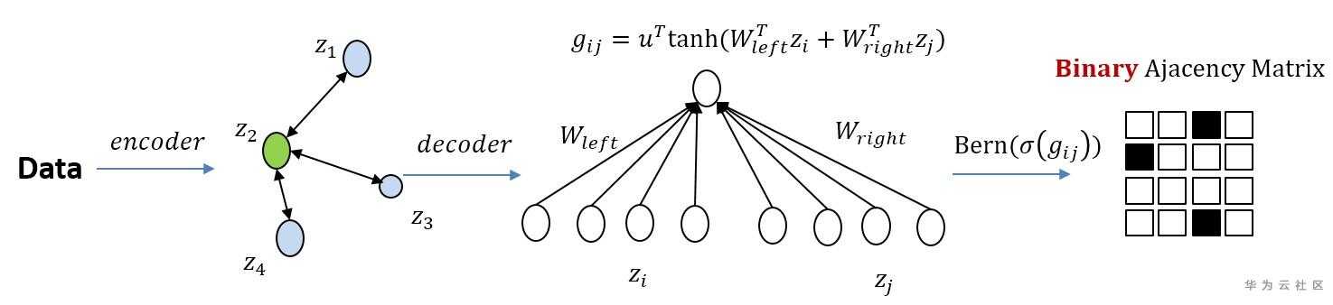 如上图所示,我们采用Transfomer中基于自注意机制的encoder, 而decoder则是通过建立成对的encoder输出之间的关系来生成图的邻接矩阵。为了得到0-1的邻接矩阵,我们将每个decoder的输出通过logistic-sigmoid函数,然后使用Bernoulli分布进行采样。