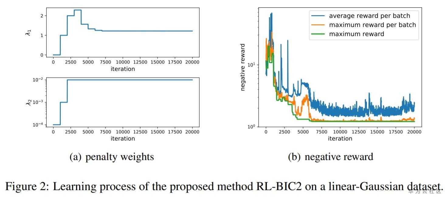其中第一项是得分函数,用于衡量给定有向图和观测数据的匹配程度,其他两个正项则衡量某些“DAGness”(给定的有向图距无环的某种度量,例如所有环上的长度之和),lambda_1和lamba_2是惩罚项的权重。通过选择适当的惩罚权重,最大化reward等价于之前打分法的问题的形式。但是两个问题等价并不意味着使用RL来最大化reward就可以直接取得很好的结果:实际中,我们发现较大的惩罚权重可能会妨碍RL的探索,得到的因果图的得分通常比较差,而较小的惩罚值将导致有环的图。同时,不同的打分函数可能具有非常不同的范围,而两个惩罚项的值与打分函数是没有关系的。因此,我们将所有的打分函数调整到一定范围,并为惩罚权重设计一种在线更新策略。详细内容可以参见论文的第5章。