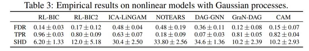 实验结果如下表3所示。对于我们的方法,我们将高斯过程回归(GPR)与RBF 核一起使用来建立因果关系模型。虽然观察到的数据是来自于高斯过程采样得到的函数,但这并不能保证具有相同核的GPR可以达到很好的结果。实际上,使用固定的核参数将导致严重的过度拟合,从而导致许多错误的边,这样训练结束最好reward对应的有向图通常不是DAG。为此我们将数据归一化处理,并使用median heuristics来选择核参数。我们两种方法的表现都不错,其中RL-BIC的结果优于其他所有方法。