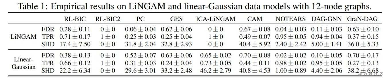 表1是我们在LiNGAM和线性高斯数据模型的实验结果。在该实验中,RL-BIC2在两个数据模型上恢复了所有真实的因果图,而RL-BIC的表现稍差。尽管如此,在相同的BIC分数下,RL-BIC在两个数据集上的表现均远好于GES。