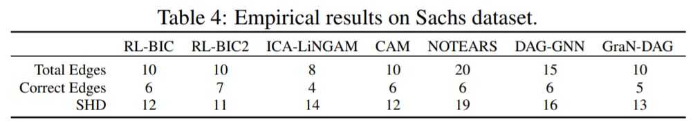 我们最后考虑Sachs数据集,通过蛋白质和磷脂的表达程度来发现蛋白质信号网络。我们将带有RBF内核的GPR应用于因果关系建模,对数据做归一化并使用基于median heuristics的核参数。我们使用和CAM及Gran-DAG中同样的减枝方法。实验结果见下表。与其他方法相比,RL-BIC和RL-BIC2均取得了不错的结果。
