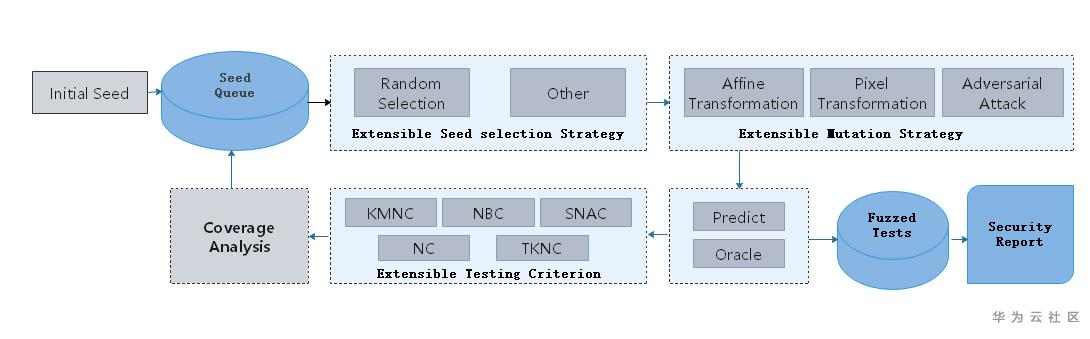 MindArmour针对深度神经网络,提供AI模型安全测试模块Fuzzer。根据神经网络的特点,引入神经元覆盖率[1]的概念,作为Fuzz的测试指导,引导Fuzz朝神经元覆盖率增加的方向生成样本,让输入能够激活更多的神经元,神经元值的分布范围更广,以充分测试DNN,探索不同类型的模型输出结果、模型错误行为。