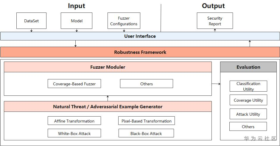 在用户接口层,需要用户提供原始数据集DataSet、被测试模型Model和配置Fuzzer参数Fuzzer configuration。Fuzzer模块对模型和数据进行Fuzz测试后,返回安全评估报告Security Report。