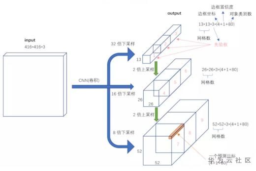 YOLOv3在输入映射到输出方面,对应三种不同尺度特征图,输出3个不同尺度的张量,是输入图像各个单元格中目标对象的概率,当输入为416×416时,在每个尺