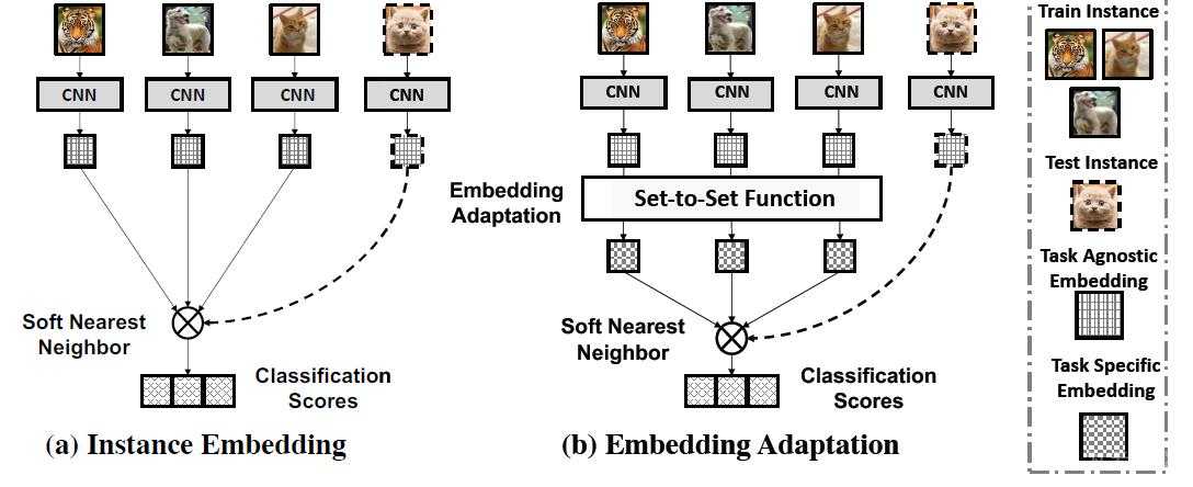 本文的主要框架下图所示。传统的小样本学习方法(a)主要学习图像的特征映射,让后基于最近邻方法对测试图像进行分类。由于该特征提取模型是通用的,没有针对目标任务进行特定的设计,在应用到不同新任务过程中可能表现不佳。本文提出的方法(b)主要学习不同分类任务之间的相关性,通过集合自适应方法,对特征提取模型进行适配,学习与目标任务相关的特征,使其适应到不同的分类任务中。