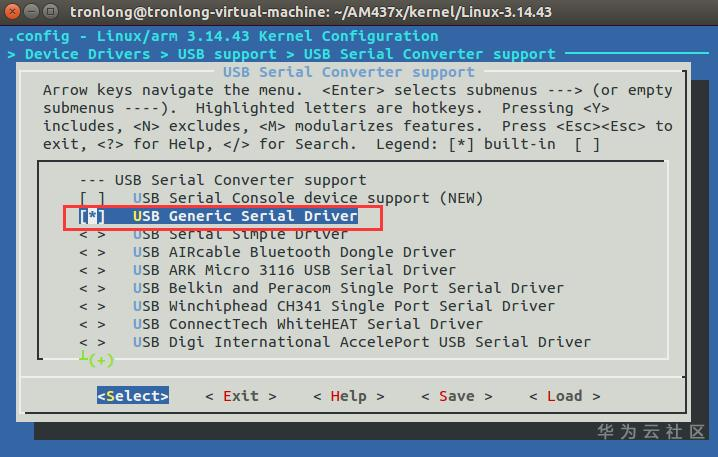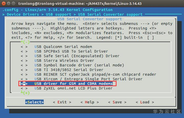 在打开的图形配置界面中,点击“Device Drivers—> USB support—> USB Serial Converter support”勾选以下选项,添加ME3620模块所需USB驱动。