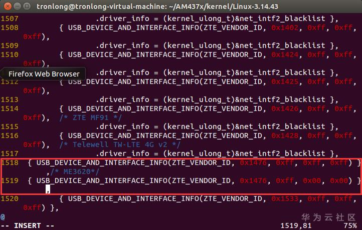 在内核源码目录下,修改“drivers/usb/serial/option.c”源码,添加VID。在下图所示位置添加如下语句,生成相应usb节点。
