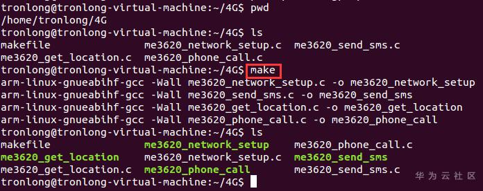 将“Demo\usb-4g\ZTE-ME3620\src”目录下的文件上传至Ubuntu的“/home/tronlong/4G”目录下,进入该目录,执行以下命令编译程序并将编译好的可执行程序拷贝到开发板“/home/root”目录下。
