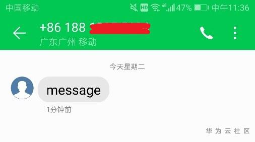 执行以下指令,通过ME3620模块发送短信,相应手机就会收到信息。