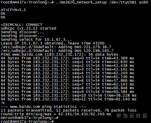 程序功能:选择ECM模式后重启生效;设置网络连接参数和ECM数据访问方式;开启DHCP以获取IP和DNS;程序利用“ping www.baidu.com”测试网络是否连接成功。