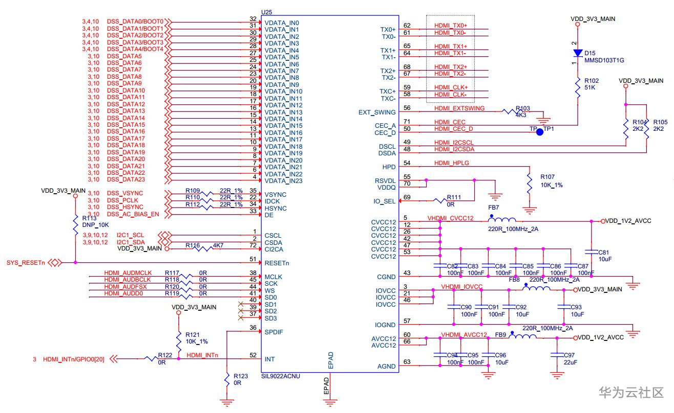 开发板J3配有高清晰度HDMI接口,采用SIL9022ACNU芯片进行转换,支持1080p高清视频,引脚定义如下图: