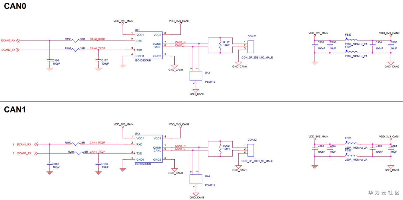 本开发板搭载有两个CAN总线接口:CAN0和CAN1。CON21和CON22为对应接线端子,使用电镀隔离的隔离式芯片ISO1050作为CAN转发器,接口定义如下图: