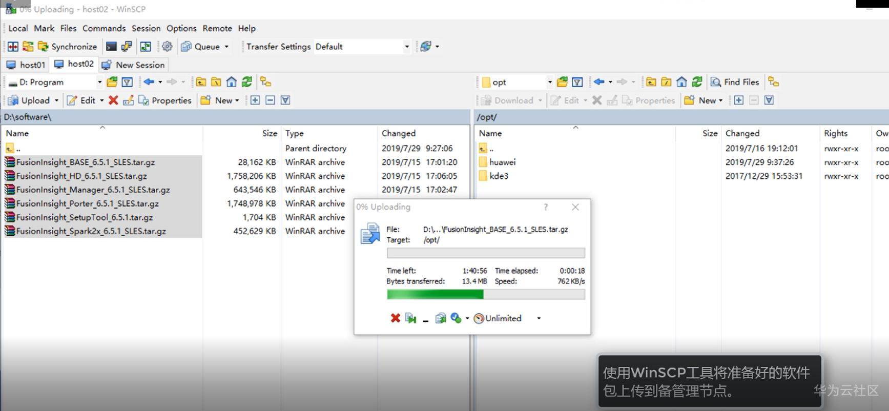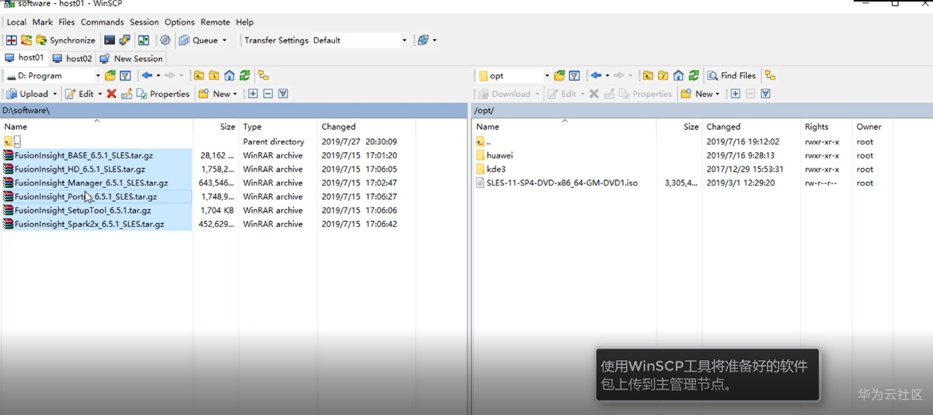 将软件包上传到host2目录下(使用WinScp工具将准备好的软件包上传到备管理节点)