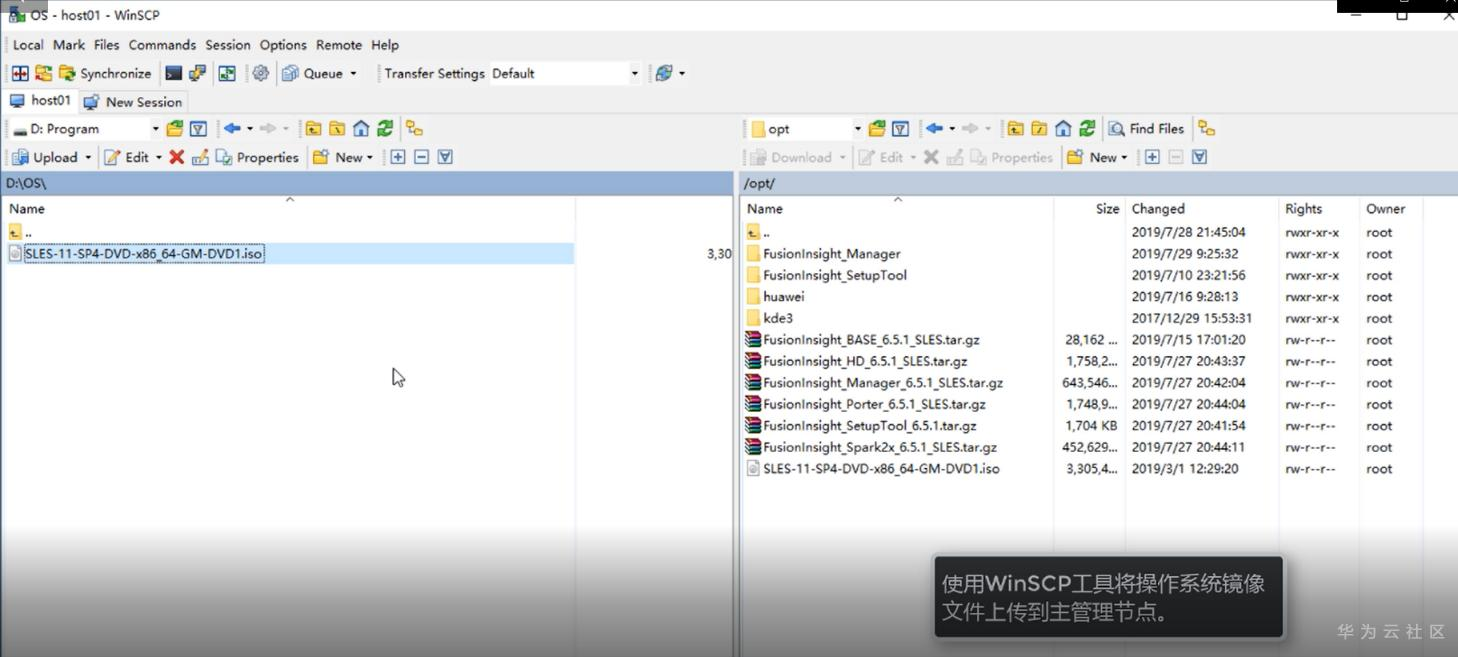 使用WinSCP工具将操作系统镜像文件上传到主管理节点。