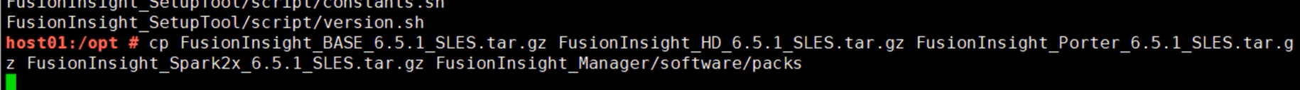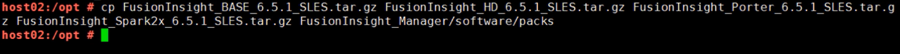 cp FusionInsight_BASE_6.5.1_SLES.tar.gz FusionInsight_HD_6.5.1_SLES.tar.gz FusionInsight_Porter_6.5.1_SLES.tar.gz FusionInsight_Spark2X_6.5.1_SLES.tar.gz FusionInsight_Manager/software/packs