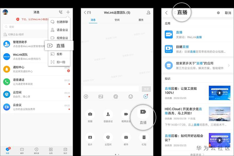 华为云WeLink作为一款移动办公软件,不仅能满足正常的办公需求,还提供直播功能,可以通过以下三步开启直播: