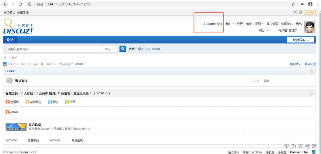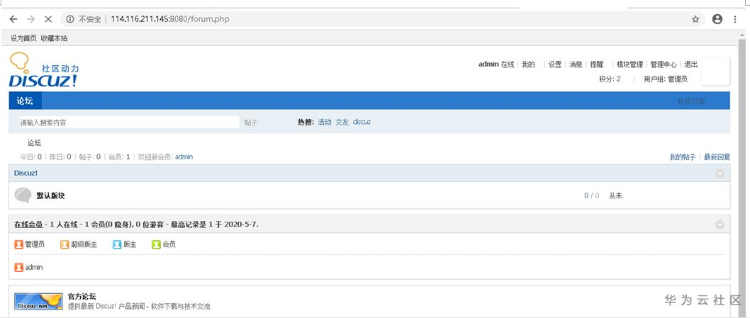 安装完成后,单击页面访问入口,并登录论坛,测试是否可用