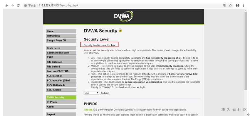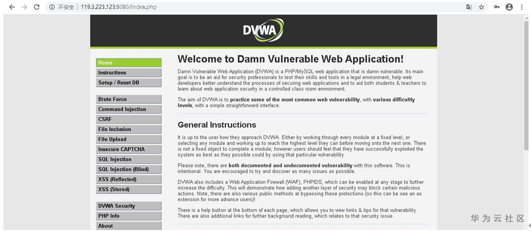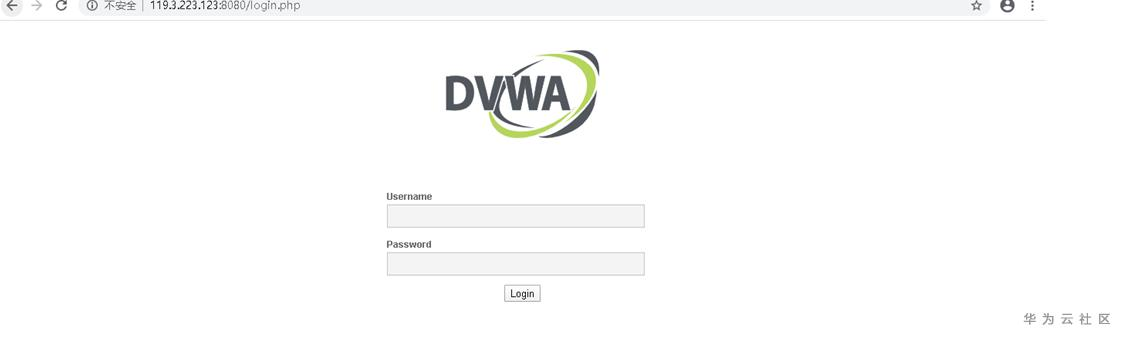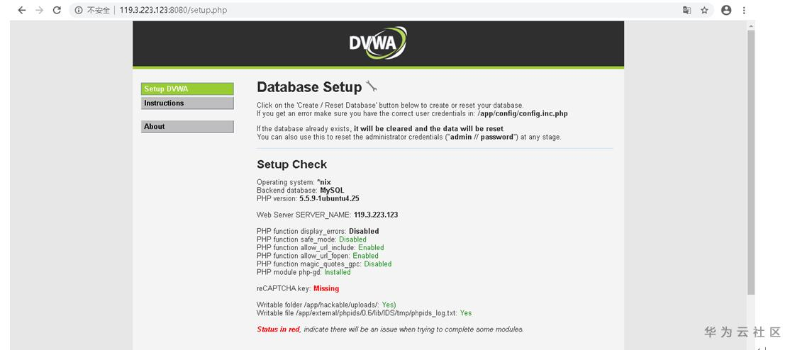 打开dvwa的页面地址http://119.3.223.123:8080 ,点击Create/Reset database
