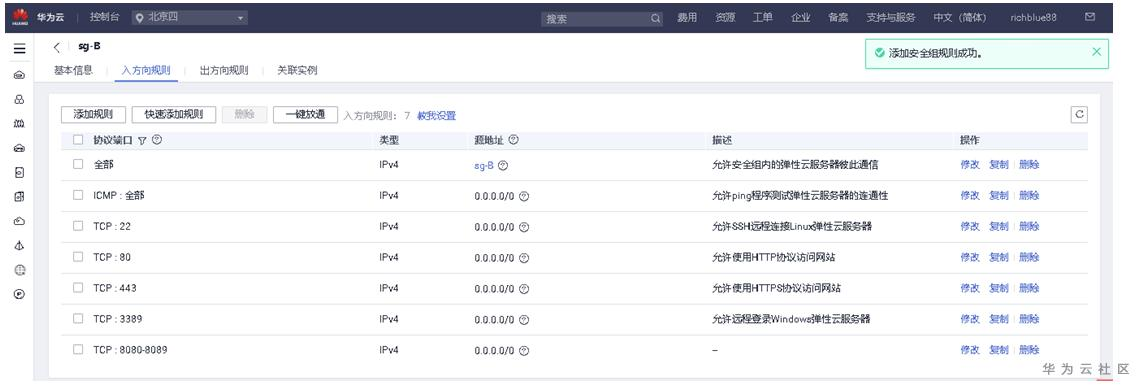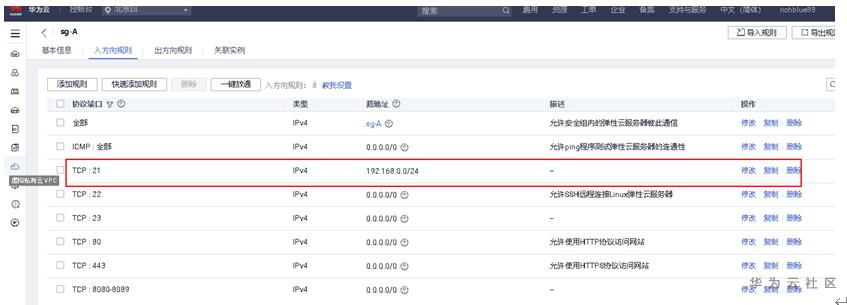 设置网络安全策略。允许通过VPC内访问ecs-dvwa主机的21端口,不允许所有用户访问ecs-dvwa的443,3389端口。