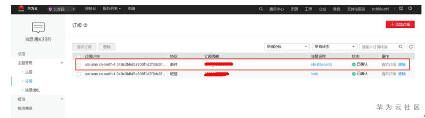 在弹出窗口选择协议:邮件,订阅终端输入“邮箱地址”该地址为接收告警通知的邮箱地址。