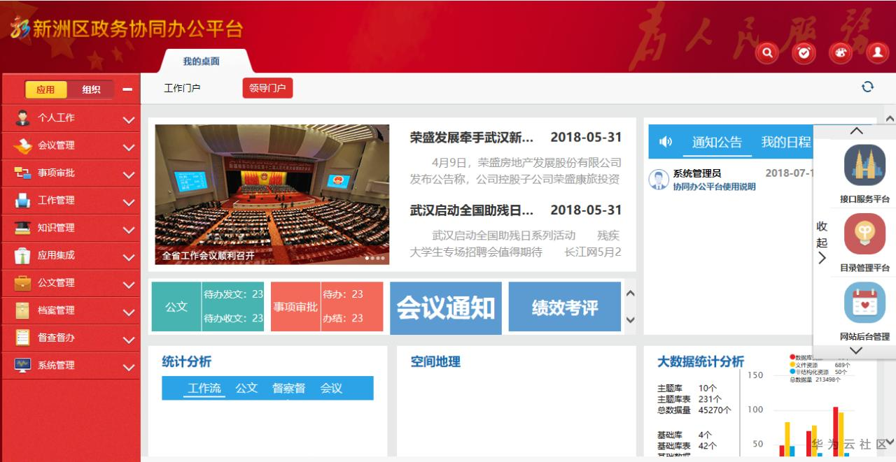 1. 主页面为门户展示,分为个人工作门户或领导门户,支持将待办工作、公告通知、新闻等直观展现在首页。