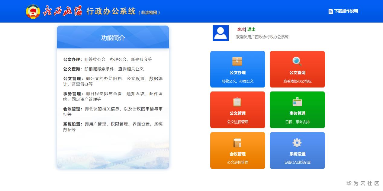 华为云严选服务商北京高速波软件有限公司结合多年政务服务的经验,结合广西政协现状,为其搭建全新的智能化管理平台,实现广西政协政务办公的智能化,推动广西政务服务之路。该平台使用华为云服务以满足性能要求,实现产品快速部署、缩减项目周期。用户可以进行公文办理、公文查询、事务管理、会议管理、系统设置、公文管理等六大功能模块的操作。