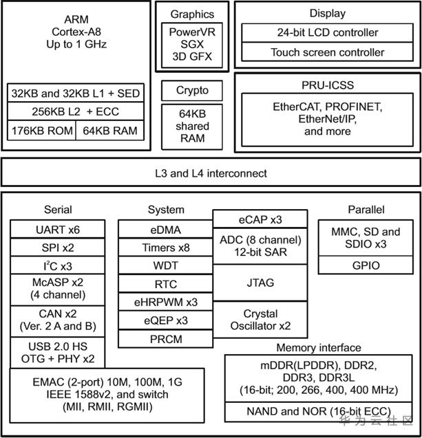 TI Sitara AM335x是一款高性能嵌入式32位工业级Cortex-A8处理器,主频可高达1GHz,运算能力可高达2000DMIPS,搭配DDR3,兼容eMMC和NAND FLASH,拥有多种工业接口资源,以下是AM335x CPU资源框图:
