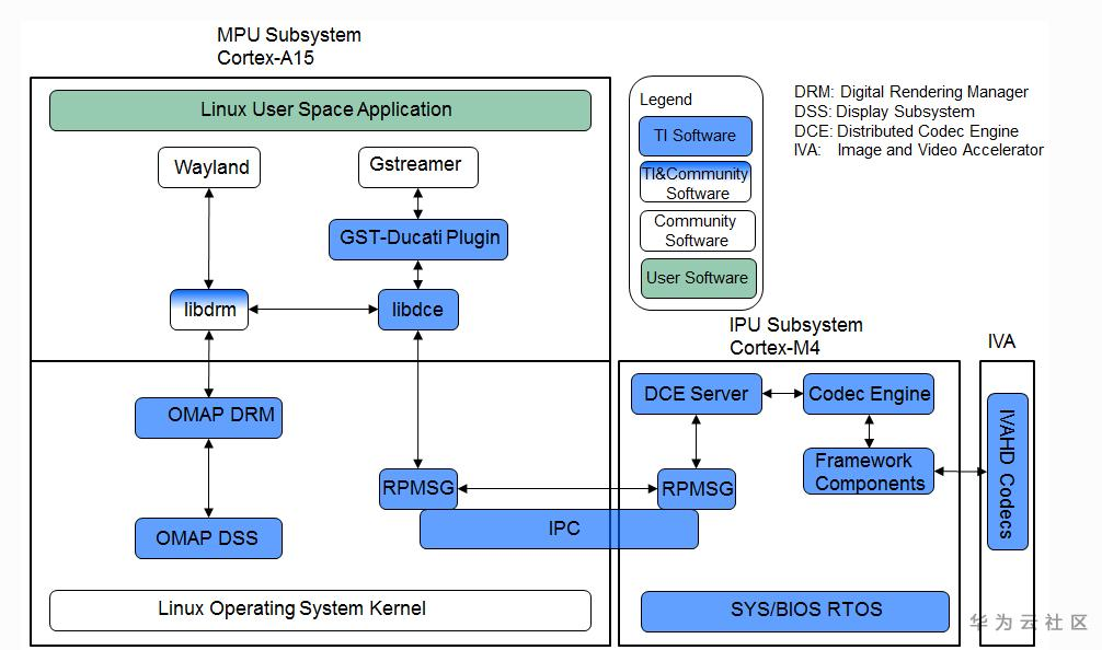 MPU:基于ARM用户空间Gstreamer应用,控制libdce模块。libdce模块在ARM RPMSG框架上实现与IPU2的IPC通信。