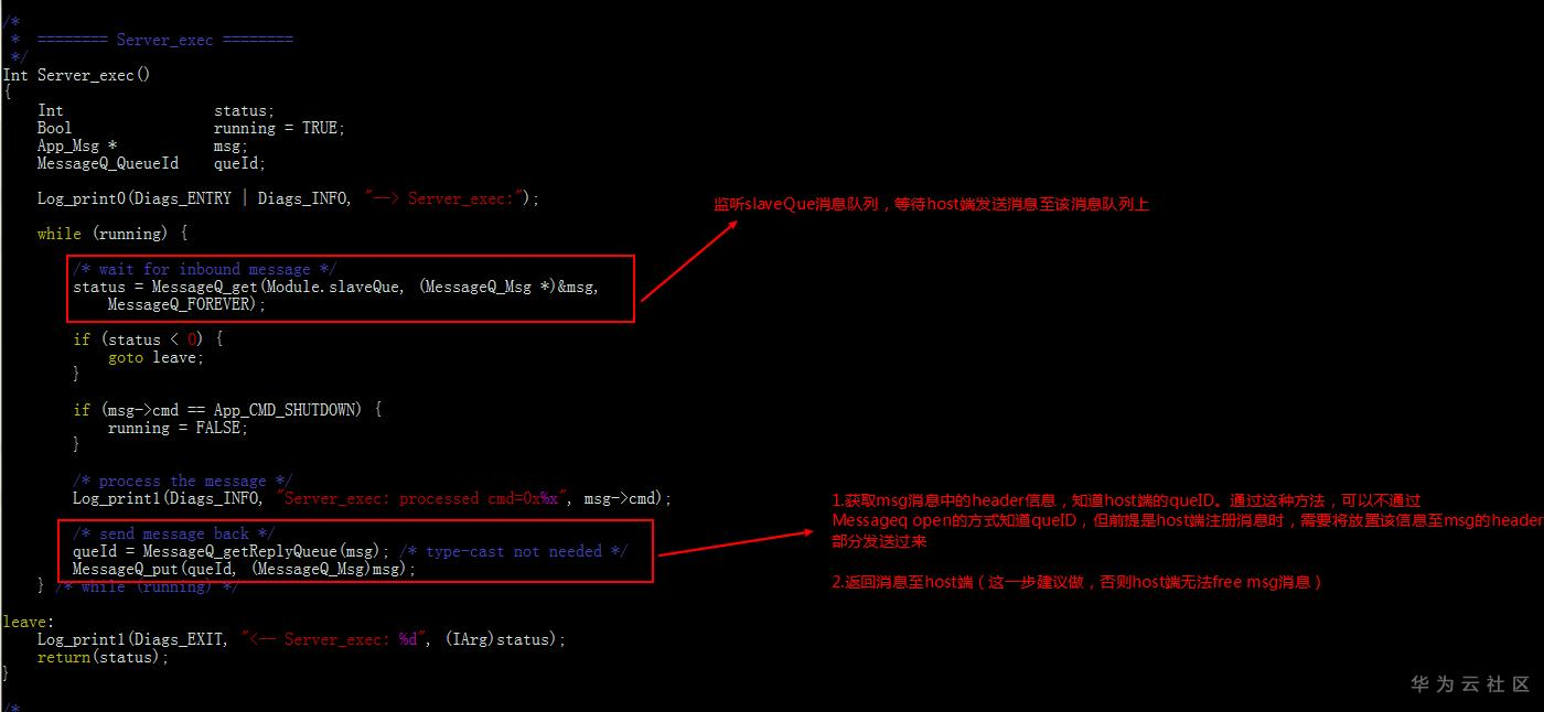 Int MessageQ_put(MessageQ_QueueId queueId, MessageQ_Msg msg):发送消息到queueId对应的消息队列。