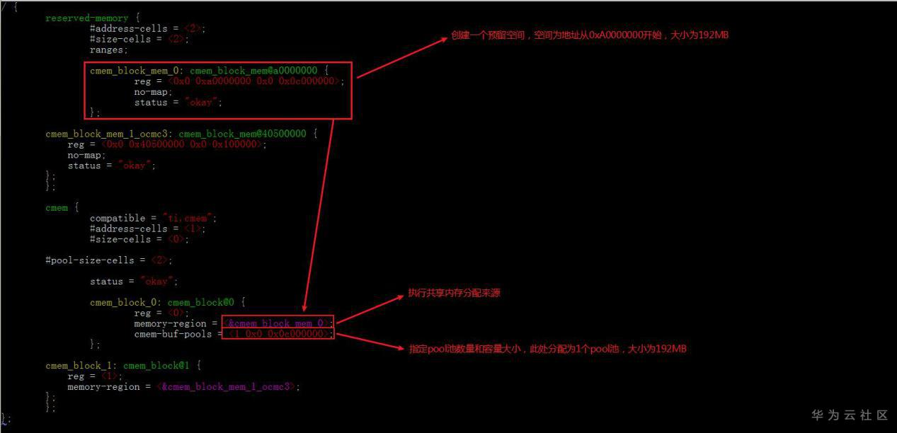 arch/arm/boot/dts/am57xx-evm-cmem.dtsi中定义了CMEM,并预留了空间出来作为共享内存(DDR & OCMC空间)。