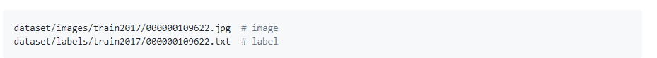 每个图像的标签文件应该可以通过在其路径名中简单地替换/images/*.jpg为来定位/labels/*.txt。示例图像和标签对为: