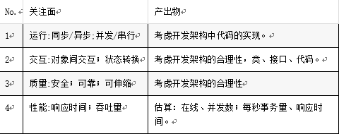 关注控制流、通讯机制、资源争用、锁/令牌环机制、同步异步、并发/串行,同时也要考虑质量属性。