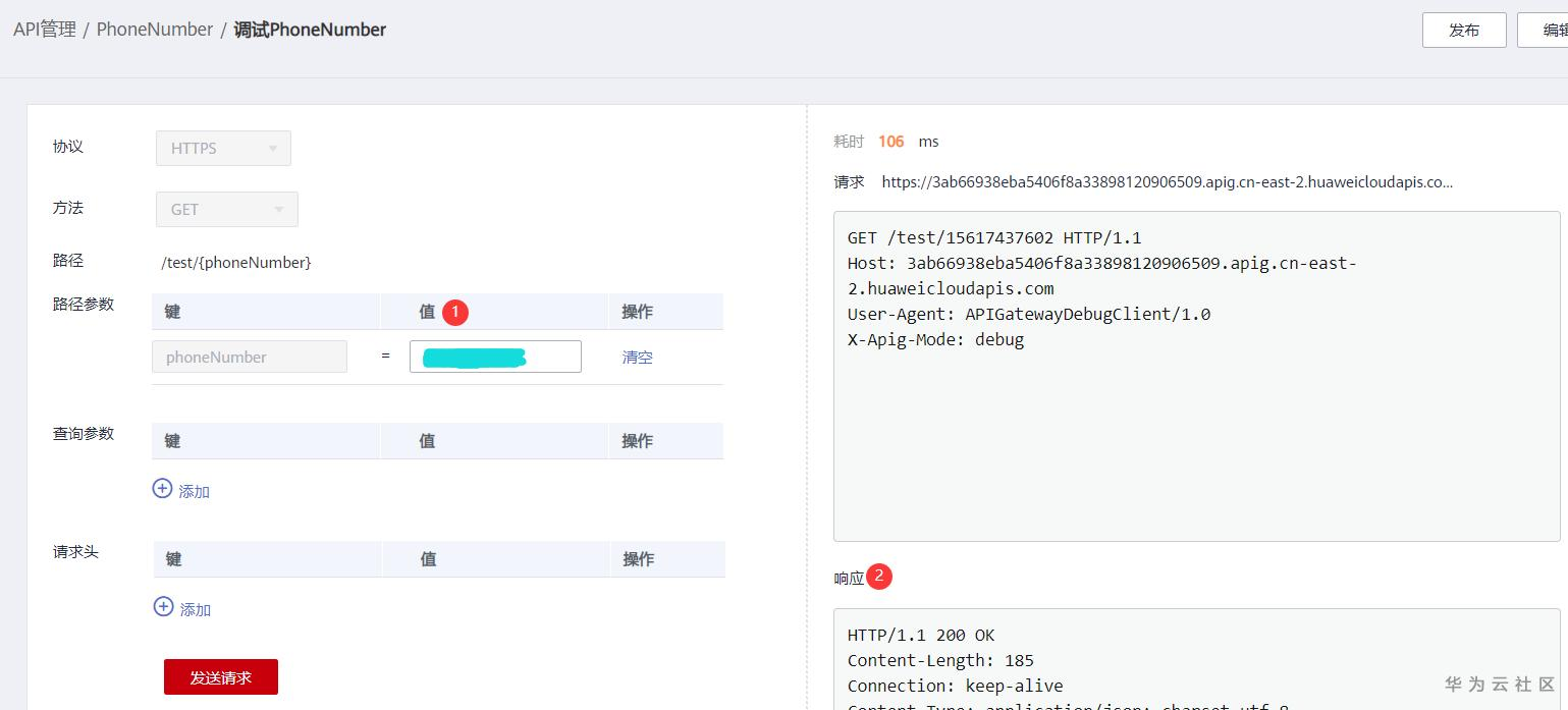 在“API管理”中找到即将调试的API,输入“值”,看“响应”是否符合源要求,达到要求后可以点击右上角或“API管理”的“发布”。