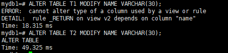 从执行结果的提示来看,t1表修改字段类型失败了,因为视图v2使用了这个字段,而t2表修改成功了,因为没有视图使用到t2的字段,虽然视图里面使用了t2表,但只是用来关联,视图的字段并没有使用t2表的字段,所以t2表的字段类型能修改成功。