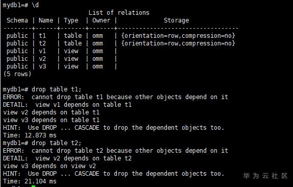 从执行结果提示来看,DROP TABLE是没有执行成功的,因为有视图依赖。可以通过DROP ...CASCADE来一起将依赖的视图删除,但是一般情况下我们不想将视图删除。