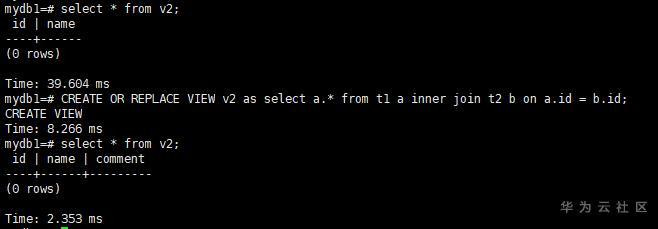 select * from v2; CREATE OR REPLACE VIEW v2 as select a.* from t1 a inner join t2 b on a.id = b.id; select * from v2;