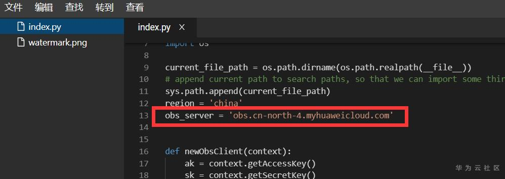 在编辑器内找到obs_server这一行,如下图所示,需要填入已经建立好的OBS的Endpoint,我选择的是北京4,如果不进行修改,则会在后续实践中出现报错、无图片输出的情况。