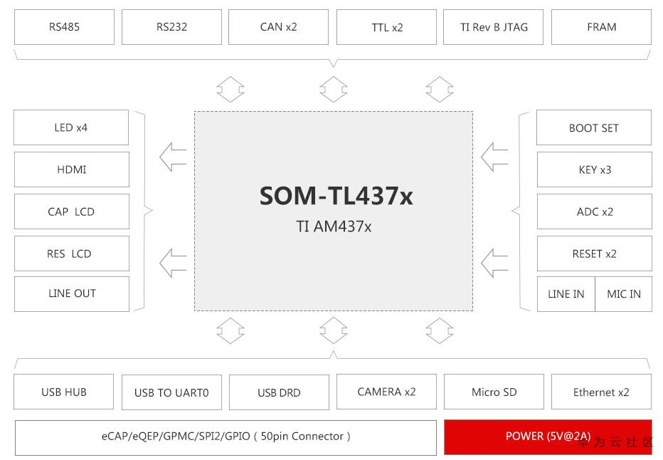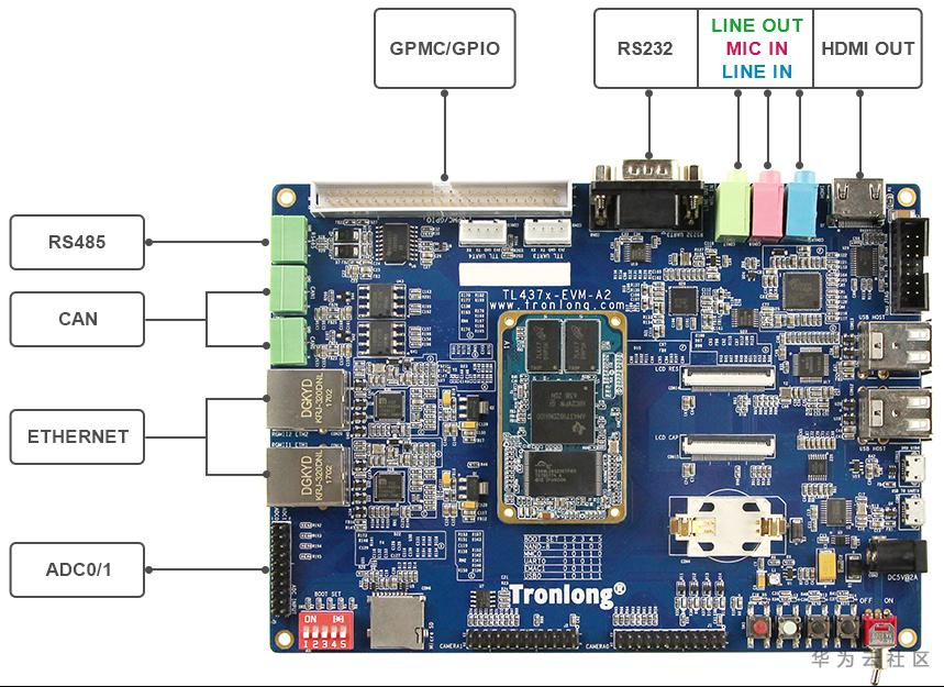 评估板接口资源丰富,引出双路千兆网口、双路CAMERA、双路CAN、HDMI、GPMC等接口,支持电容触摸屏与电阻触摸屏,方便用户快速进行产品方案评估与技术预研。