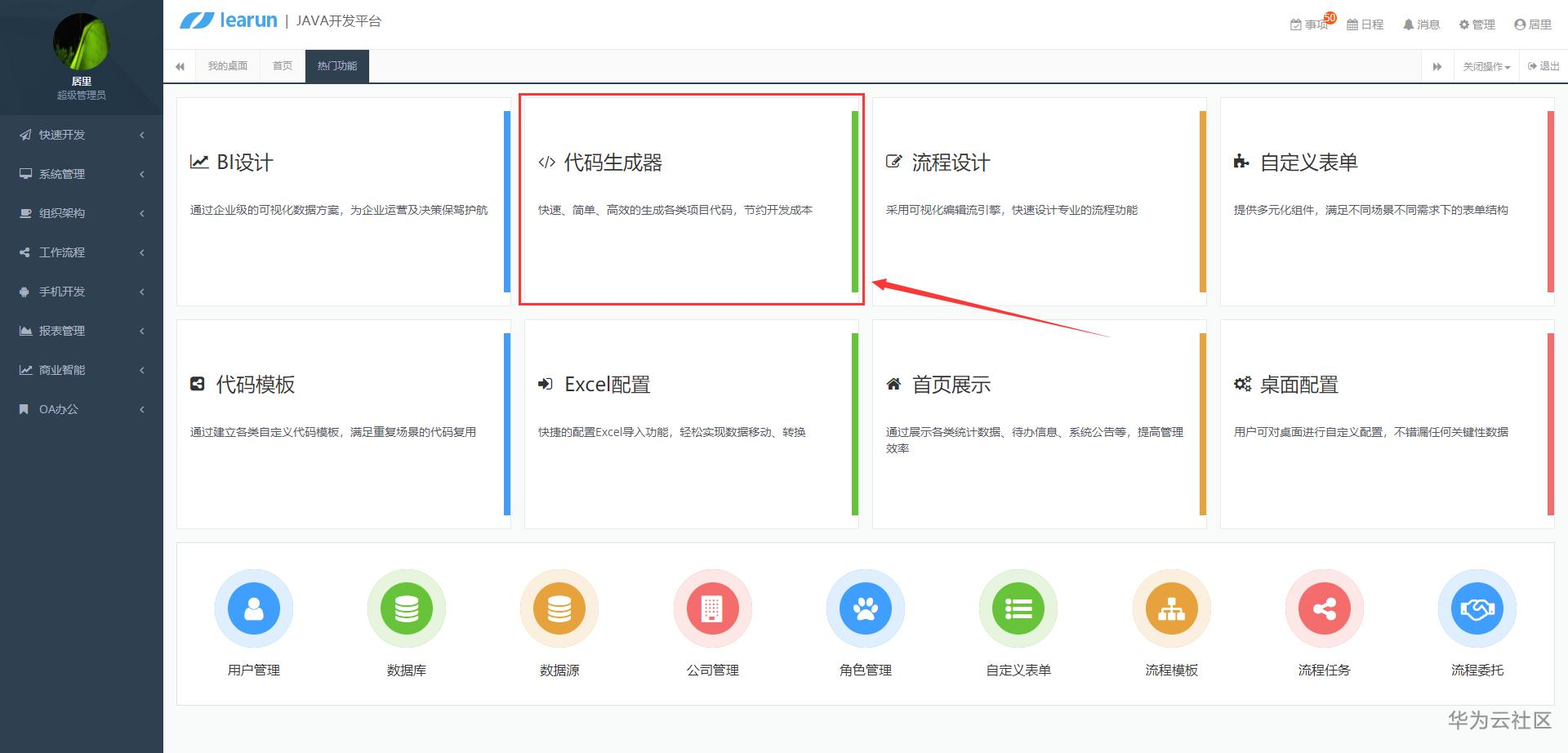 验证后登入系统平台,点击首页的代码生成器