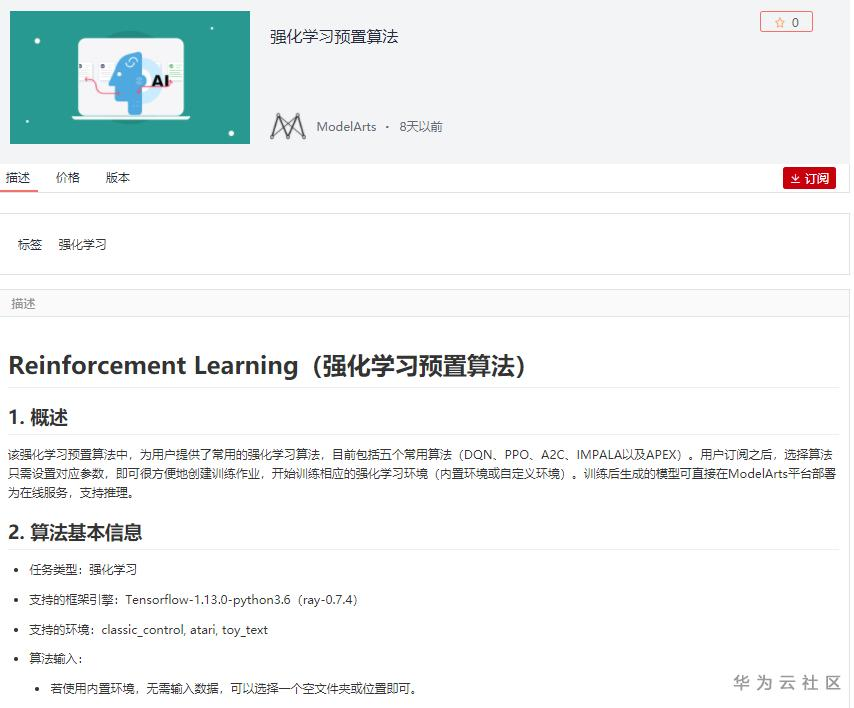 本篇博客,就教你使用ModelArts的AI市场上强化学习预置算法,0代码训练一个可以玩Atari游戏的智能体模型。其中,在ModelArts的AI市场上,强化学习预置算法的链接是: