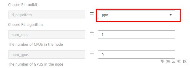 关于强化学习算法,我们选择PPO,也就是将对应的参数设置为“ppo”,如下图所示。对于其他参数保持默认即可。