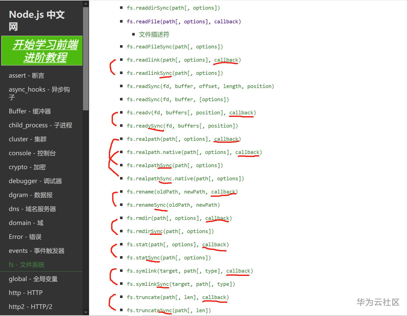 回调函数,我们从字面意思理解一下它,就是回头再来调用的函数,是不是?所以说回调函数在完成任务后就会被调用,在Node.js中,使用了大量的回调函数,几乎所有的API都支持回调函数,我截了个Node.js的API截图,大家看看规律: