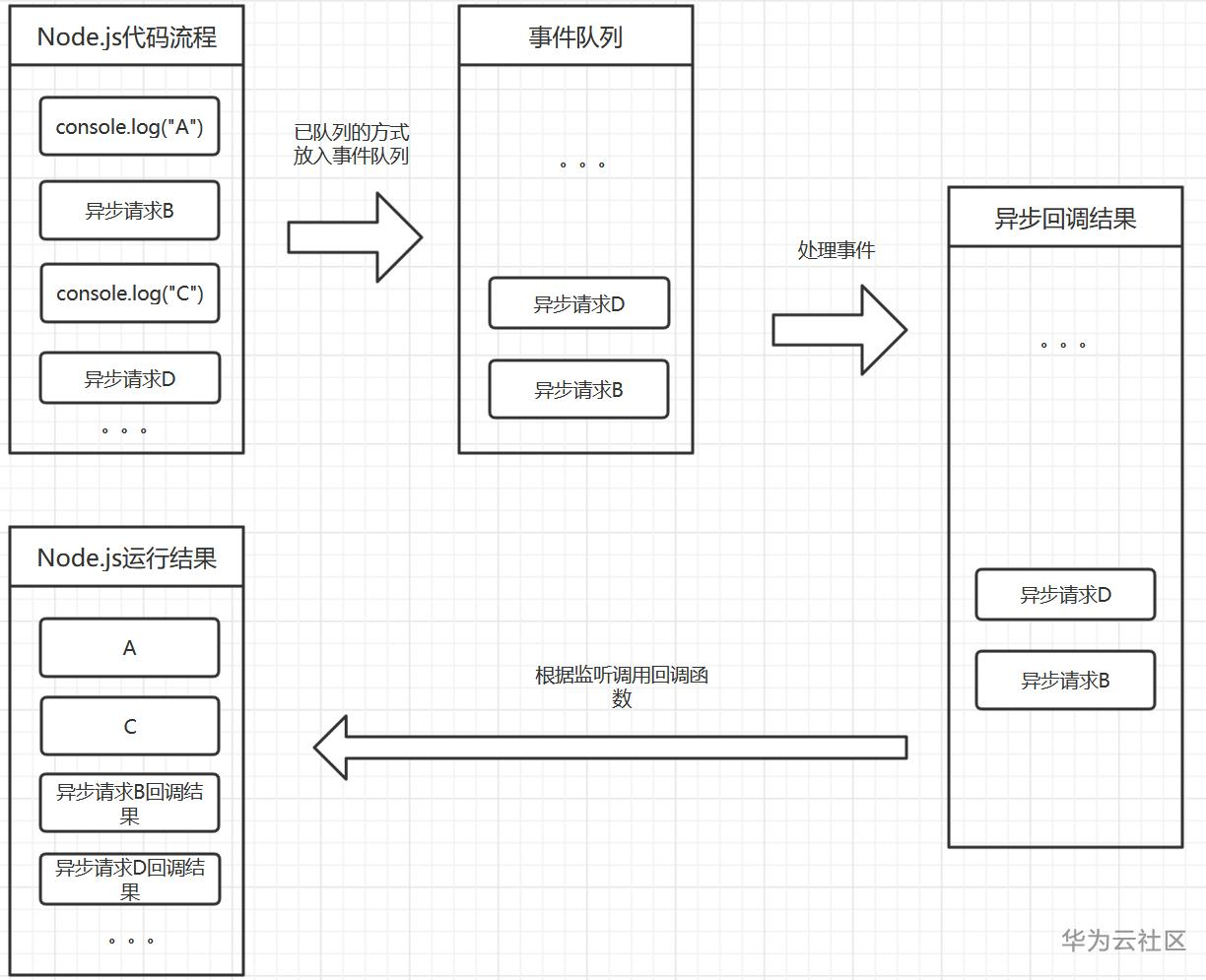 我们简单解释一下这个流程:前端发起请求,web服务器接收请求,然后将这个条请求放到事件队列里,此时不做任何读写操作,接着执行下面的代码,而放置到事件队列里的事件,回按先进先出的顺序,去处理事件,处理完的结果,放到处理完了的事件队列里,我上图起名叫回调结果队列,然后当程序监听到这个事件被处理完了的时候就会触发回调函数,然后再返回给Node.js的运行结果中。我理解是这样的一个流程,如果有什么不准确或者错误的地方,希望看到的同学批评指正哈~
