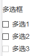 <lable for="name">多选标签应用</lable> <div class="checkbox checked"> <label> <input type="checkbox" value="" checked> 多选1 </label> </div> <div class="checkbox"> <label> <input type="checkbox" value=""> 多选2 </label> </div> <div class="checkbox disabled"> <label> <input type="checkbox" value="" disabled> 多选3 </label> </div>