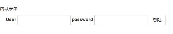 <div id="container" style="width:96%;margin-left:2%;"> <form class="form-inline"> <div class="form-group"> <label for="User">User</label> <input type="text" class="form-control" id="User"> </div> <div class="form-group"> <label for="password">password</label> <input type="password" class="form-control" id="password"> </div> <div class="form-group"> <lable for="saveUser" class="sr-only"></lable> <input type="checkbox" id="saveUser"> 记住用户名 </div> <button type="submit" class="btn btn-default">登陆</button> </form></div>
