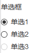 <lable for="name">单选标签应用</lable><div class="radio"> <label> <input type="radio" name="optionsRadios" id="option1" value="1" checked>单选1 </label> </div><div class="radio"> <label> <input type="radio" name="optionsRadios" id="option2" value="2" >单选2 </label> </div><div class="radio"> <label> <input type="radio" name="optionsRadios" id="option3" value="3" disabled>单选3 </label> </div>