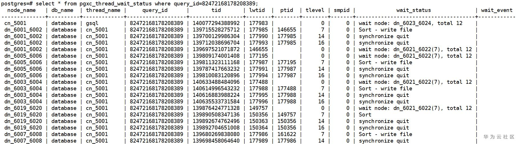 类似地,gs_开头的用于查看当前CN节点上收集的信息,pgxc_开头的则包含集群中所有CN收集的信息。两个视图的定义与上一节的自诊断视图基本相同,使用方法也基本一致。 通过观察其中的字段,可以发现正在运行的SQL中存在的性能问题。
